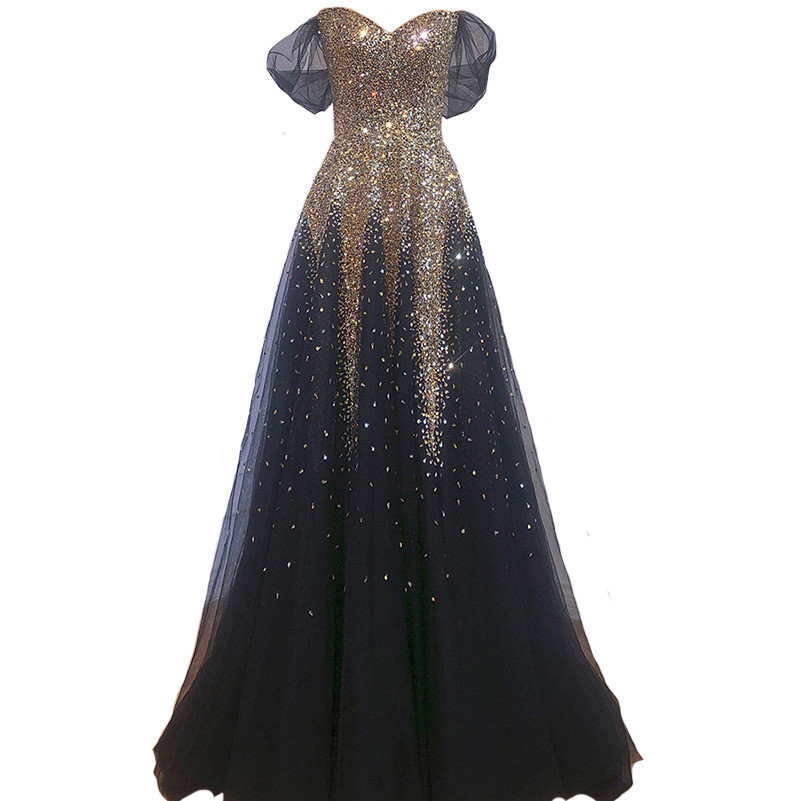 Black Gold One Word Shoulder Hosting Banquet Bride Toasting Evening Dress
