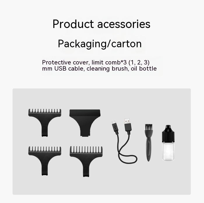 Product accessories: protective cover, limit comb * 3 (1,2,3) mm, USB cable, cleaning brush, oil bottle