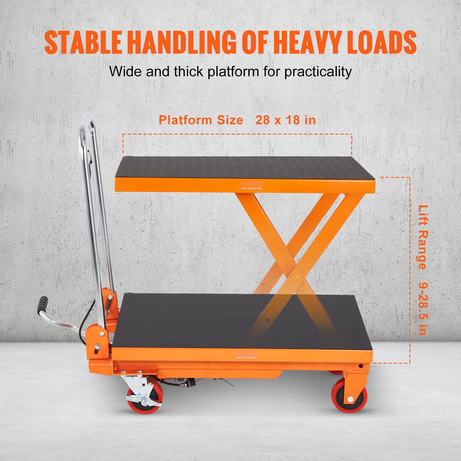 Premium Hydraulic Pump: Experience impressive lift heights up to 28.5 inches with VEVOR hydraulic lift table cart. Our high-quality integrated hydraulic pump ensures efficient and reliable lifting without any oil leakage issues. Get the power you need for smooth and controlled lifting performance.